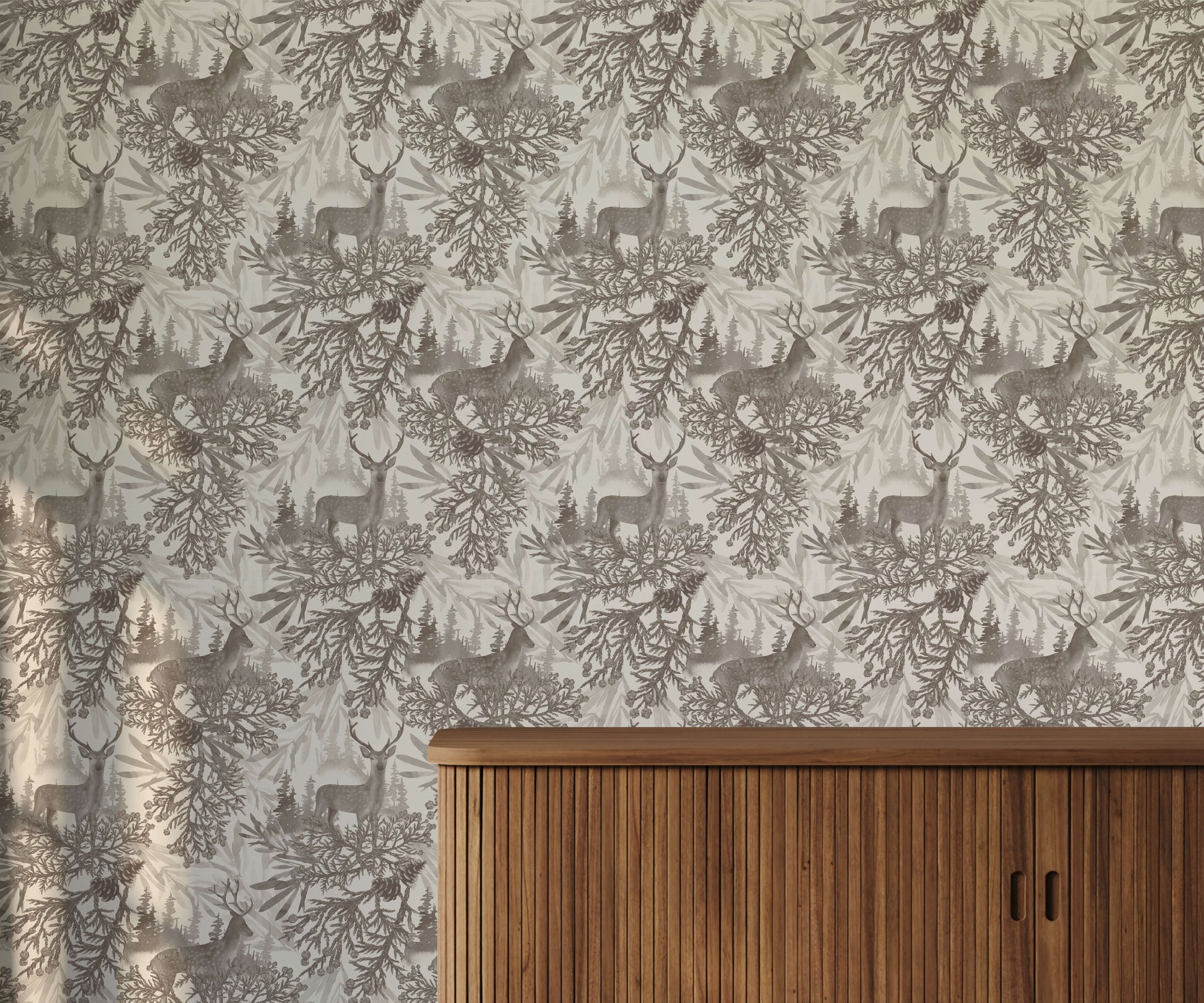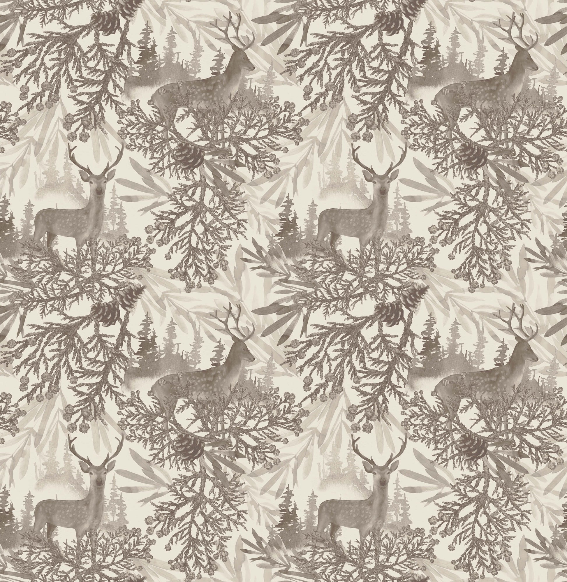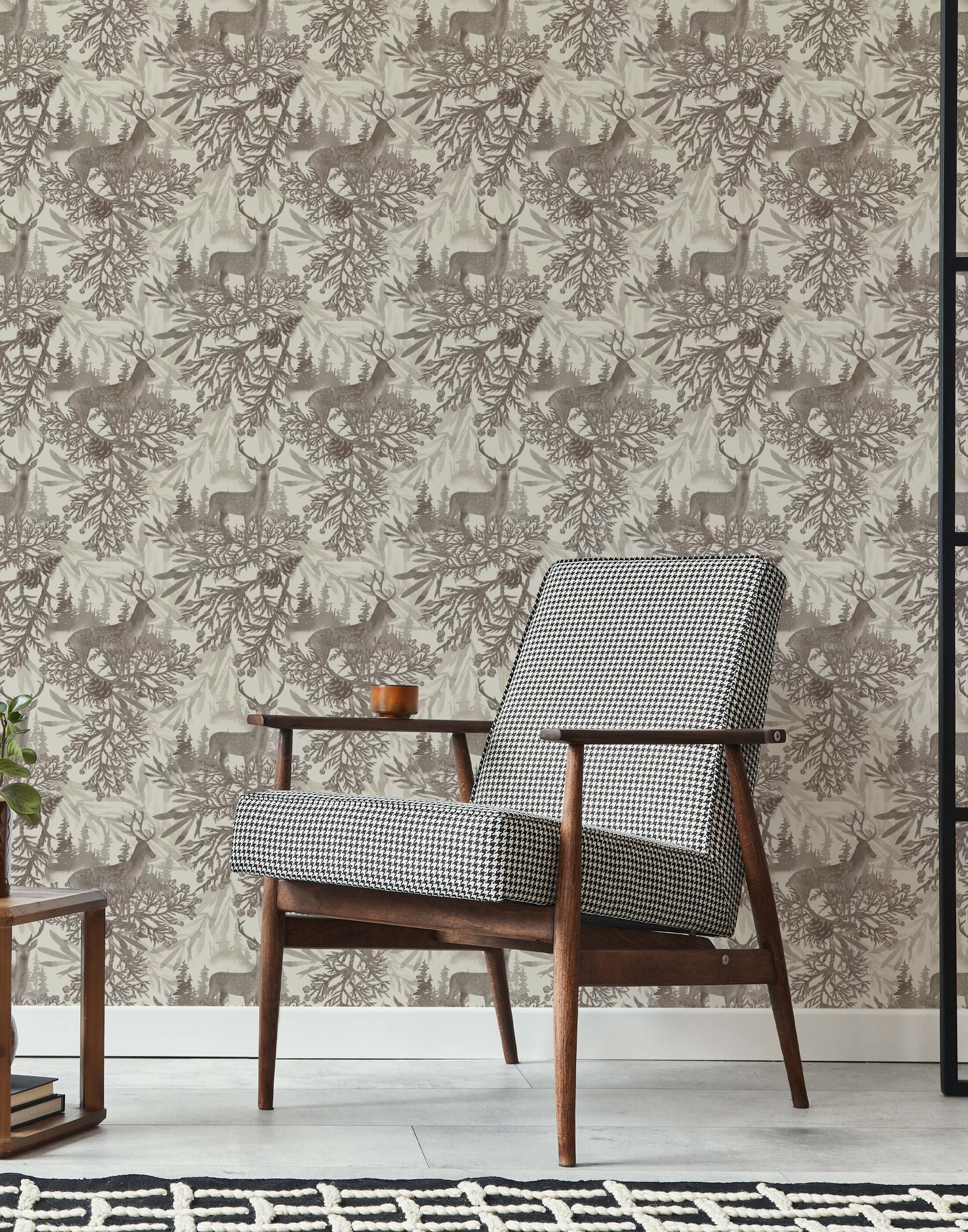 Bring rustic charm to your space with our stag wallpaper. The design, which comes in soft brown tones, features watercolour stags amongst branches and leaves.