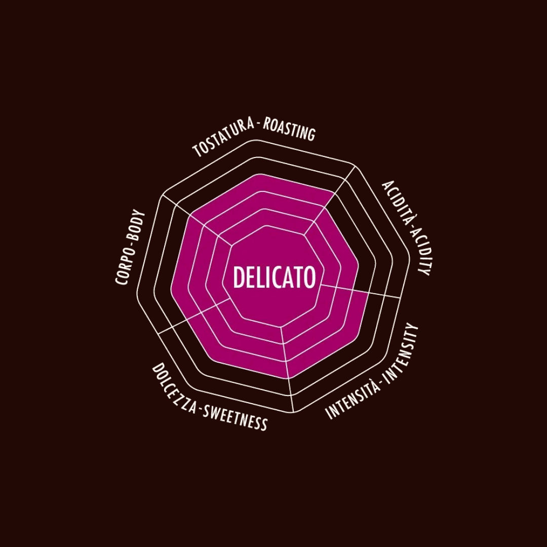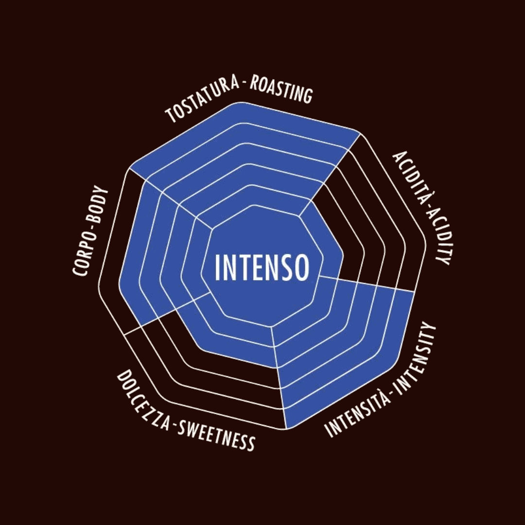 A bold, dark-roasted blend crafted from premium Indian Robusta beans. Intenso delivers a concentrated Italian coffee experience, with deep notes of bitter cocoa and an intense, full-bodied character. Ideal for those who love a strong, punchy espresso or prefer to add sugar while still tasting the coffee's depth. -