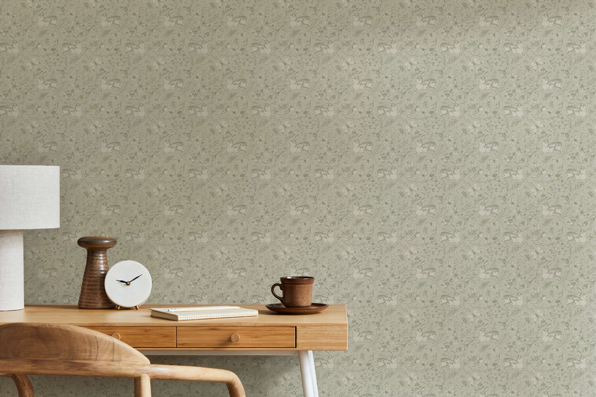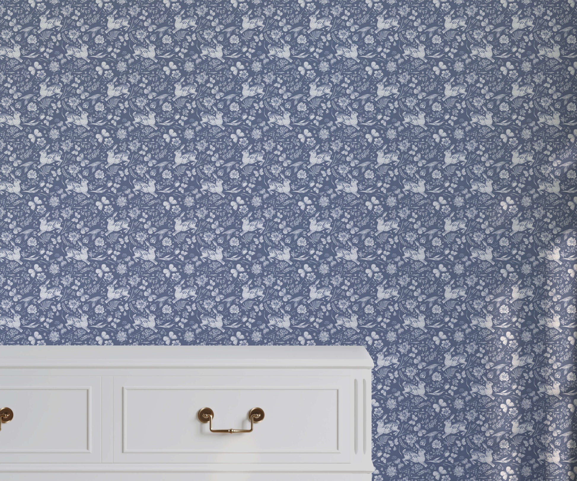 This wallpaper creates a visually captivating focal point for your walls that adds a touch of folkloric sophistication to your home decor. Embrace the charm of Scandinavian traditions and the whimsical presence of rabbits, fostering an ambiance that is both cosy and visually enchanting.