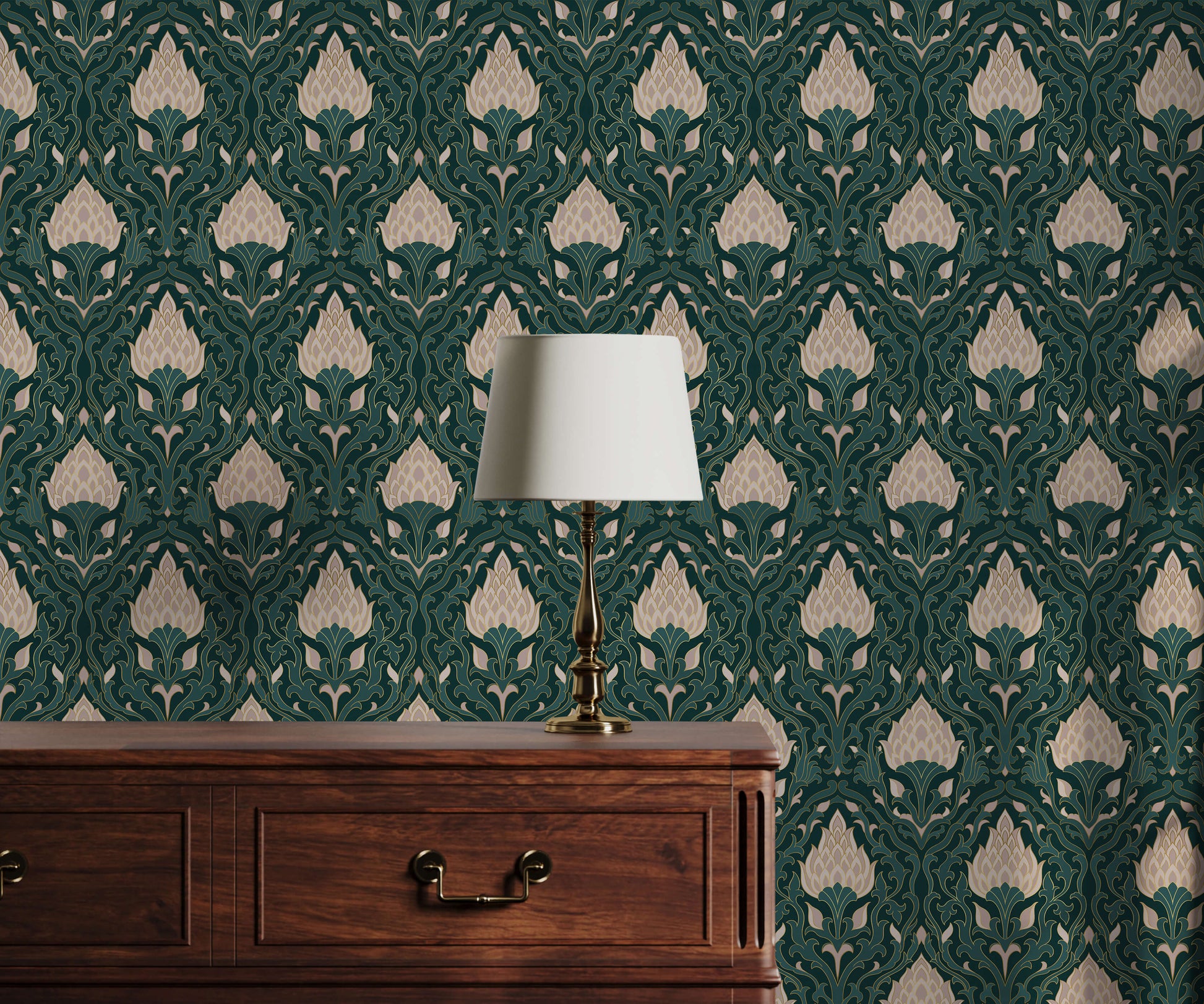 The arts & crafts lotus wallpaper draws inspiration from the timeless elegance of the Arts and Crafts movement, featuring a beautifully detailed lotus motif in a repeating pattern that exudes natural grace. Each lotus flower, with its layered petals and soft curves, is framed by intricate swirling foliage that adds depth and richness to the design. The balance between the bold floral elements and the flowing, organic forms creates a harmonious and refined composition. This wallpaper brings a sense of handcrafted artistry to your space, reflecting the movement's celebration of nature and craftsmanship. Ideal for adding a touch of vintage charm and sophistication to interiors, the arts & crafts lotus wallpaper is perfect for those who appreciate intricate, nature-inspired designs that offer both visual interest and timeless beauty. This wallpaper transforms any room into a refined and calming retreat, making it a stunning addition to living rooms, bedrooms, or dining areas.
