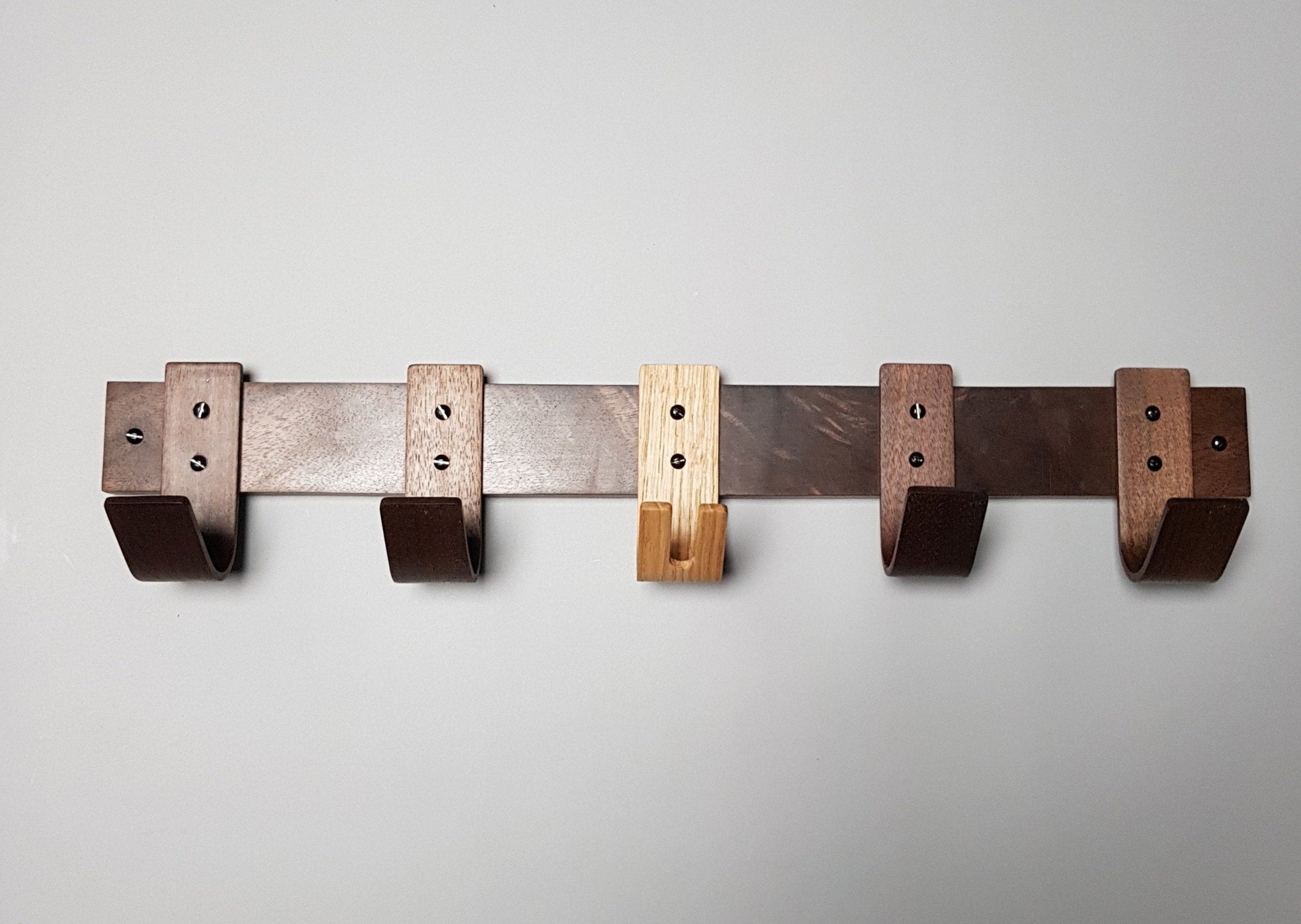 - Two-tone hardwood design – Solid oak backboard paired with rich American black walnut hooks for a striking yet timeless contrast