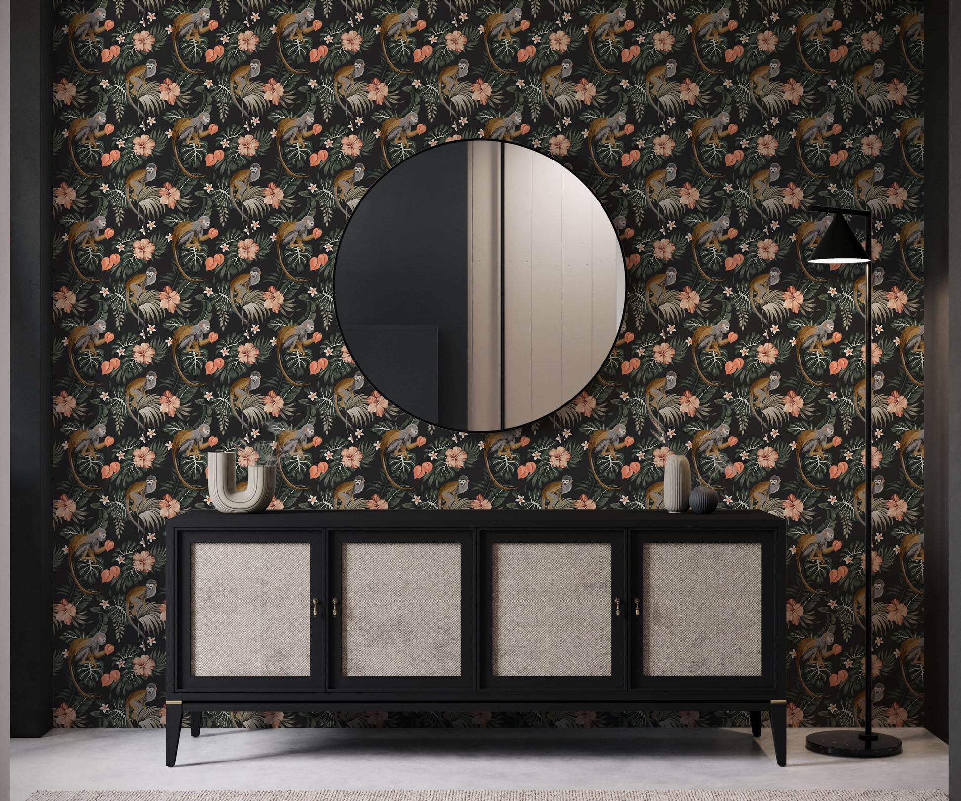 This beautiful monkey wallpaper brings the charm of the tropics right into your living space. It features cute little monkeys amongst hibiscus flowers and foliage. Rich greens and browns complement the black background with pops of luscious peach to help the design stand out.