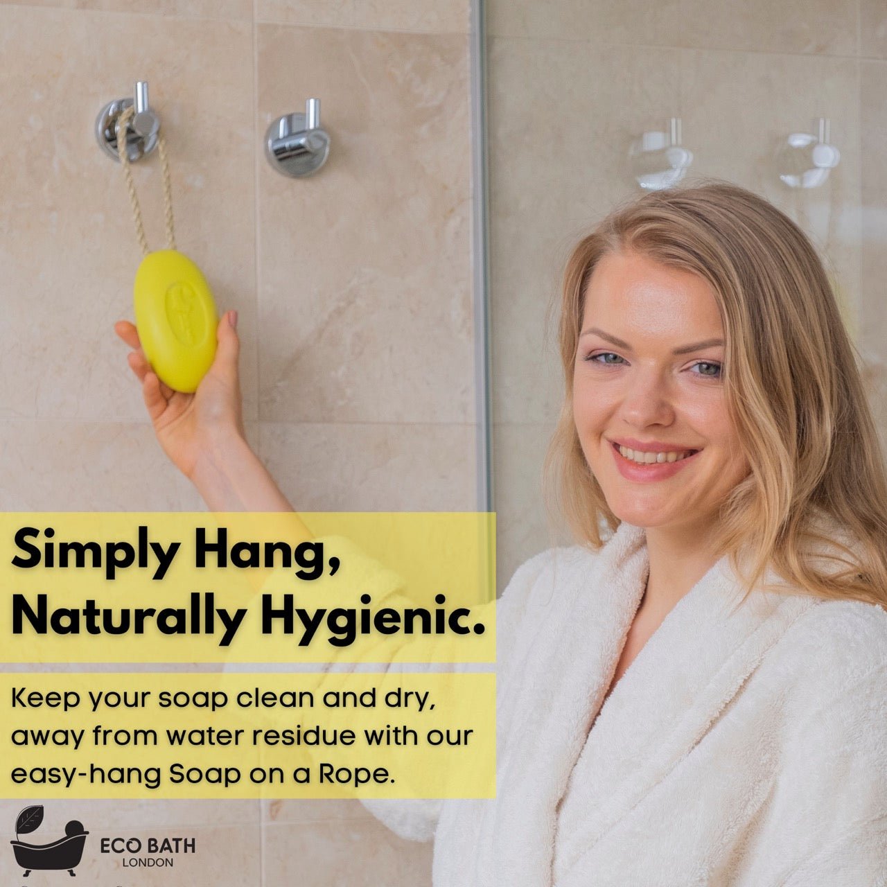 The Eco Bath London Lime Soap on a Rope is designed for convenience and ease of use. The sturdy rope handle lets you hang the soap bar to dry between uses, keeping it fresh and lasting longer. Made from high-quality natural ingredients, this soap bar is gentle on the skin, making it suitable for all skin types. Whether you're looking to enhance your daily shower routine or seeking a natural alternative to traditional body washes, this soap-on-a-rope is an essential addition to your bathroom.
