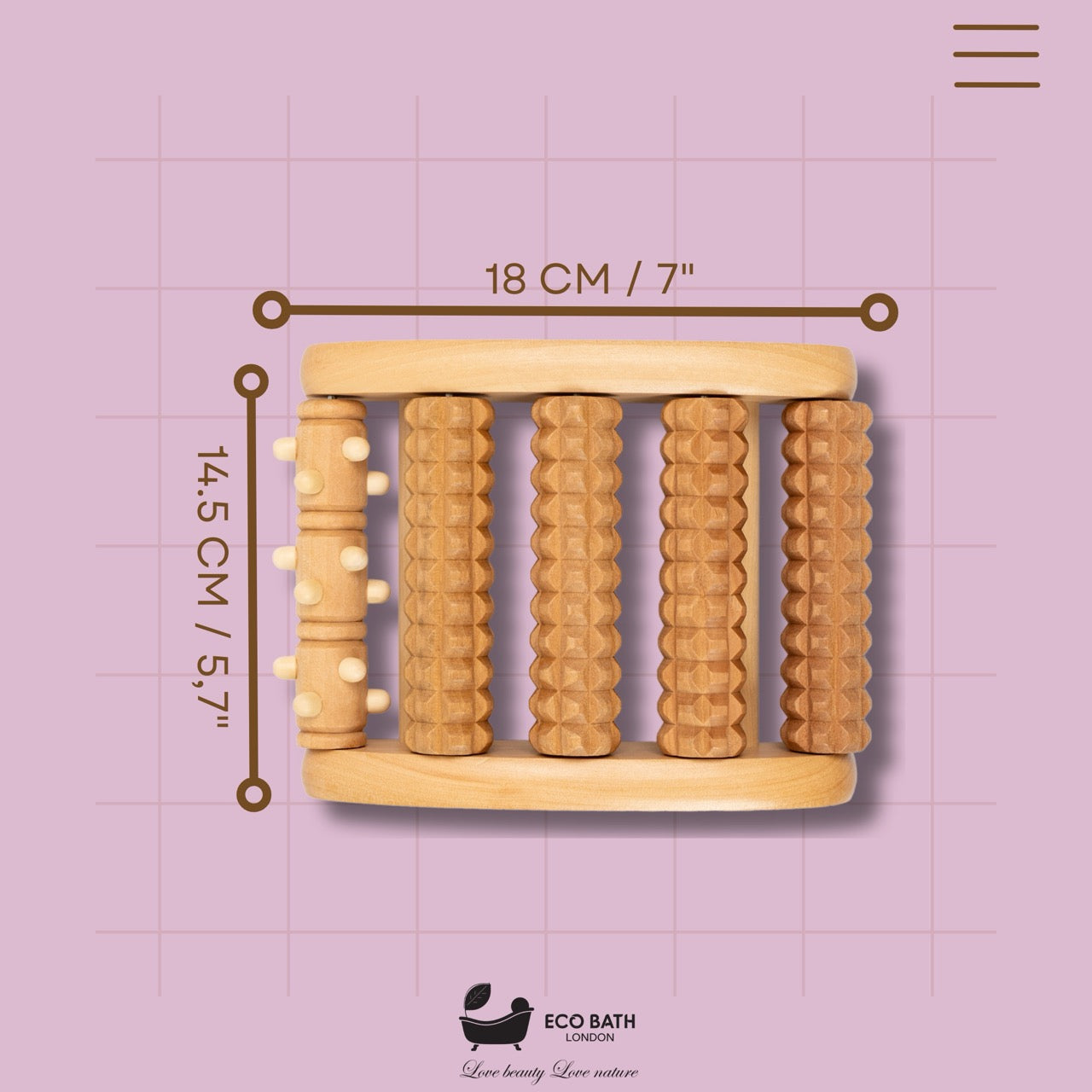 Enhance your foot care routine with the Eco Bath London Reflexology Foot Roller. This wooden foot massager targets reflexology points on your feet, providing a deep, therapeutic massage that helps relieve pain and improve circulation. Ideal for those with plantar fasciitis or general foot discomfort, this massager offers effective pain relief and promotes overall foot health.