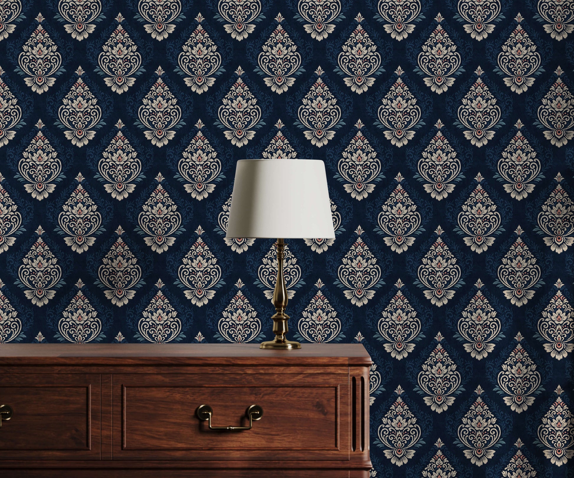 If you'd like to introduce depth, heritage and a clear sense of occasion to your décor, this damask medallion design is a standout choice. Its dense, multi-layered pattern helps to ground a scheme, making spaces feel intimate, refined and carefully curated.