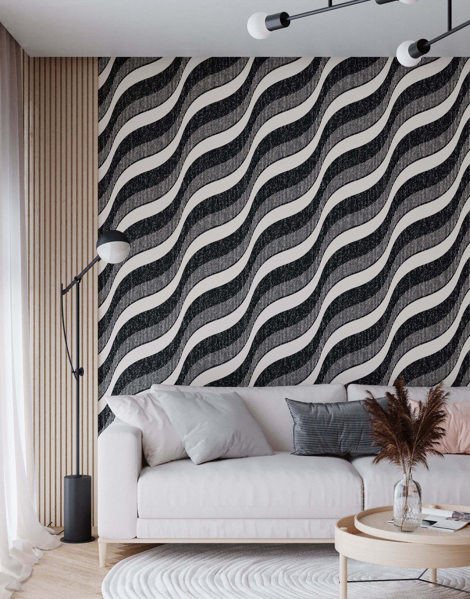 The style of this intriguing design is almost reminiscent of a vintage optical illusion, with simple black-and-white lines and shading combining to create a fantastic effect. With just two colours, this retro wave wallpaper is incredibly versatile and will be an excellent fit for most spaces.