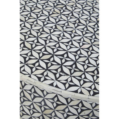 Designed to command attention without crowding your layout, this circular centrepiece pairs a black top detailed with white bone inlay and shell accents with a gleaming column pedestal in a warm gold tone. The result is a refined mix of contrast and texture that suits modern, classic, and eclectic spaces alike.