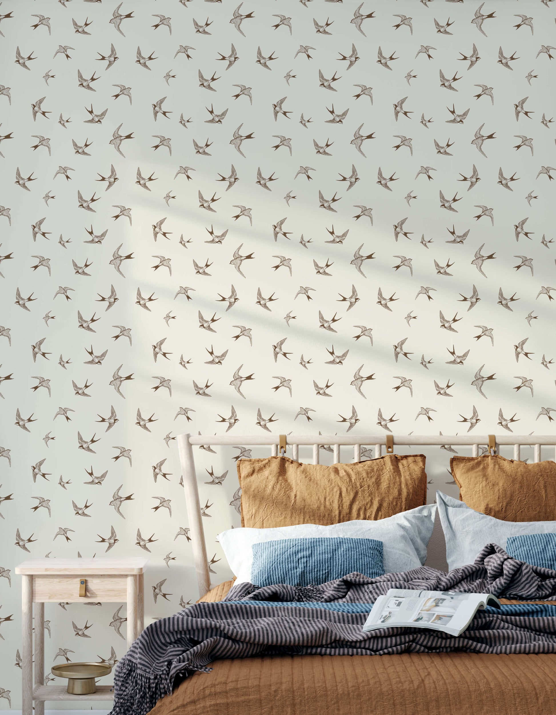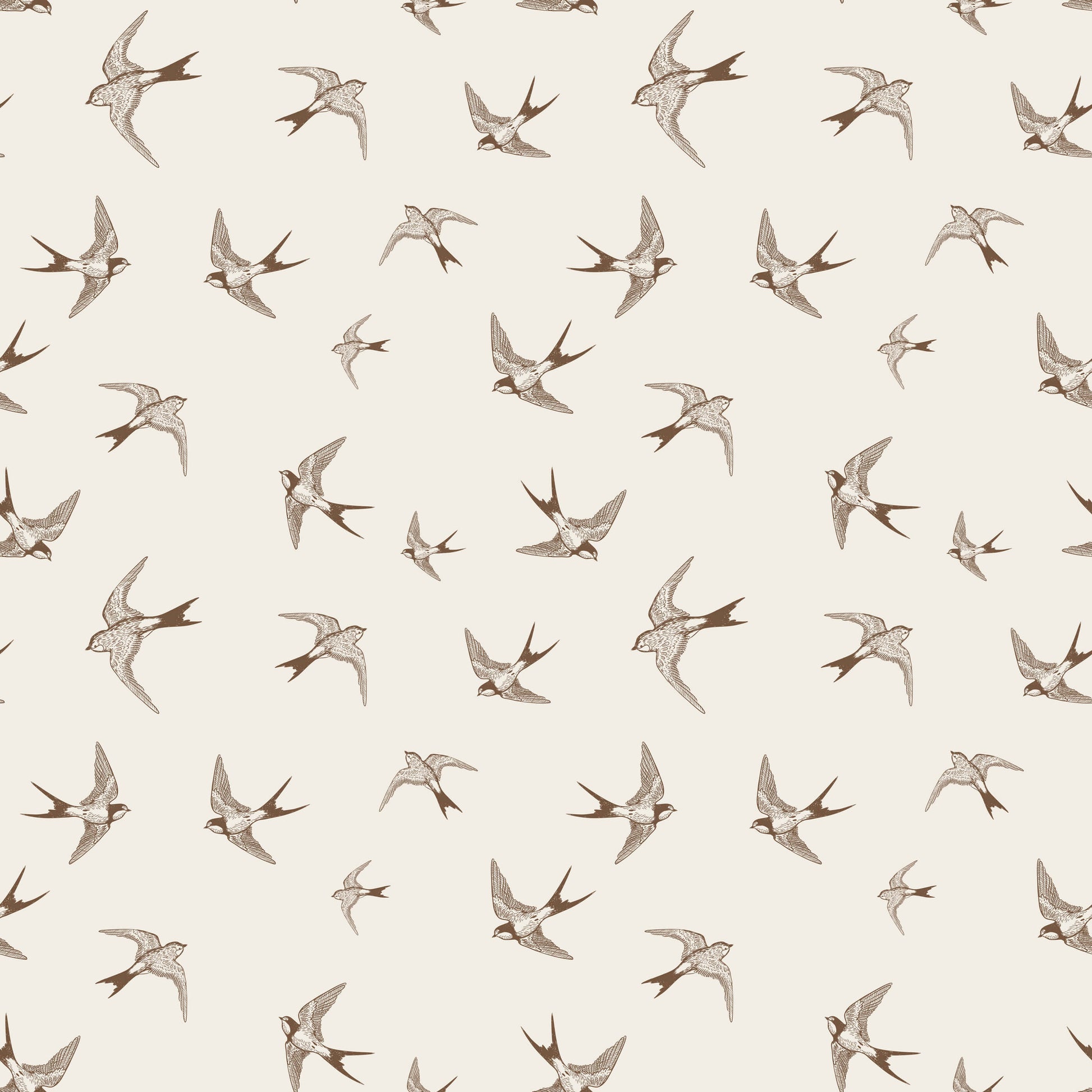 Our swallow wallpaper will add a charming, graceful touch to your design scheme. This elegant design features intricate depictions of swallows in flight in soft brown tones, creating a visually enchanting and serene atmosphere.