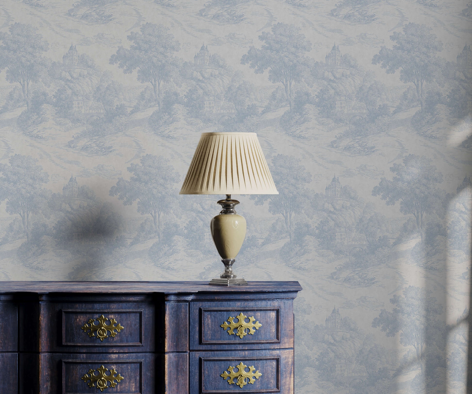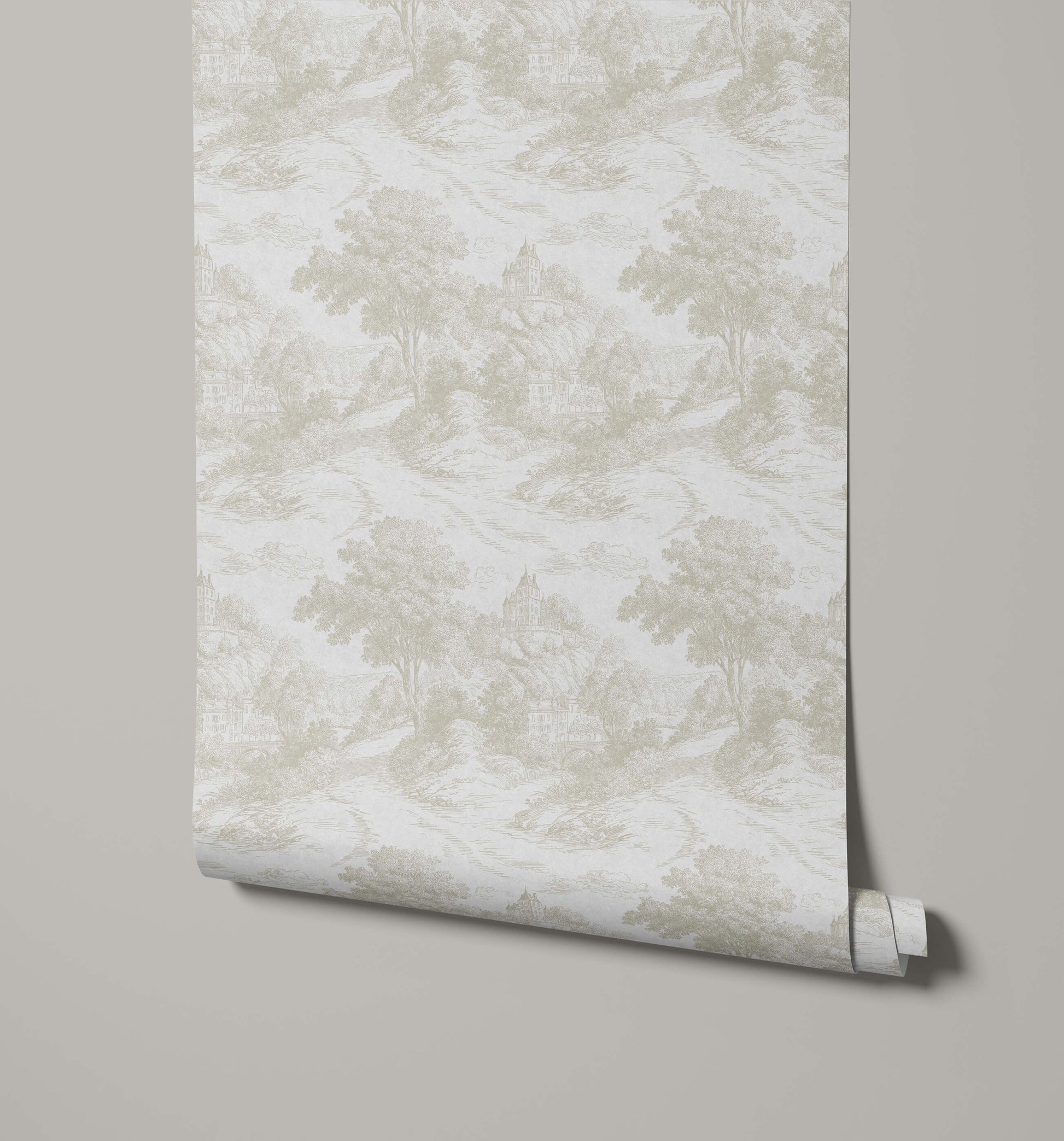 Bring quiet storybook elegance to your walls with this Toile Pattern Wallpaper. Inspired by classical landscapes, it wraps your space in finely drawn scenes that feel both refined and gently nostalgic. Detailed trees, winding pathways and distant buildings unfold across the design, creating a calm, pastoral world that invites the eye to linger.