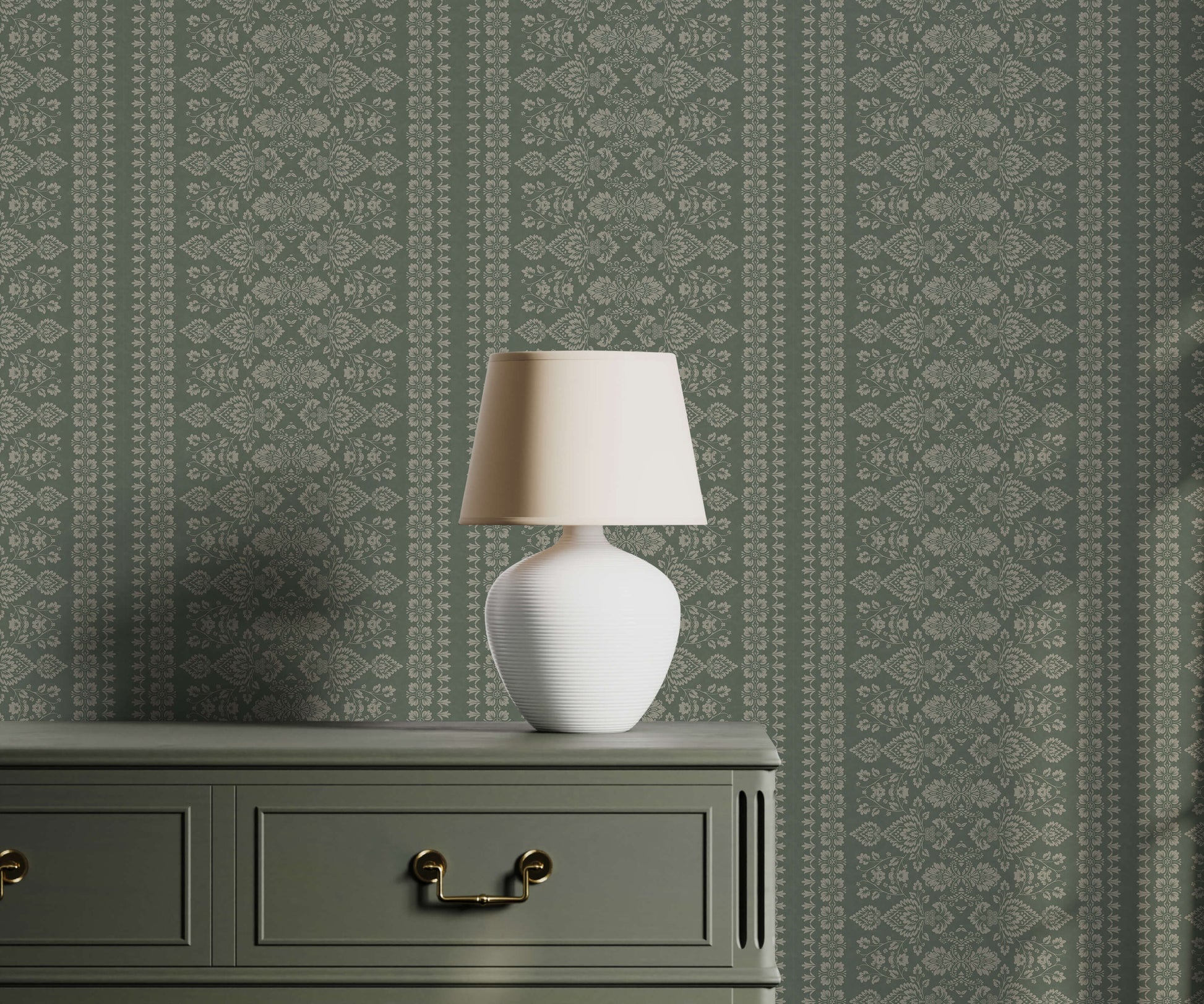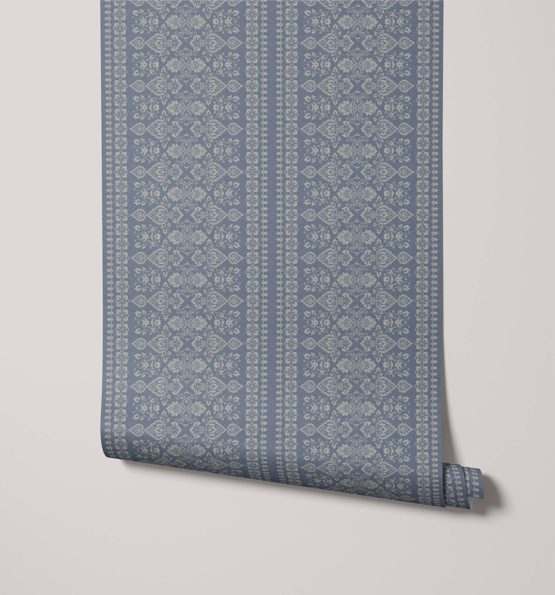 - Damask and stripe combined – Alternating columns of ornate floral scrollwork and narrower solid bands for a classic, structured look
