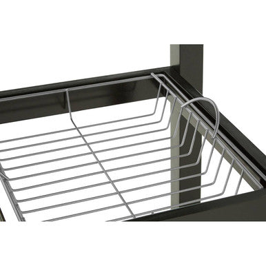 This kitchen trolley features a robust frame with two open storage compartments beneath a convenient slide-out drawer. One compartment is fitted to hold two removable metal trays—ideal for keeping your essentials organised and accessible.