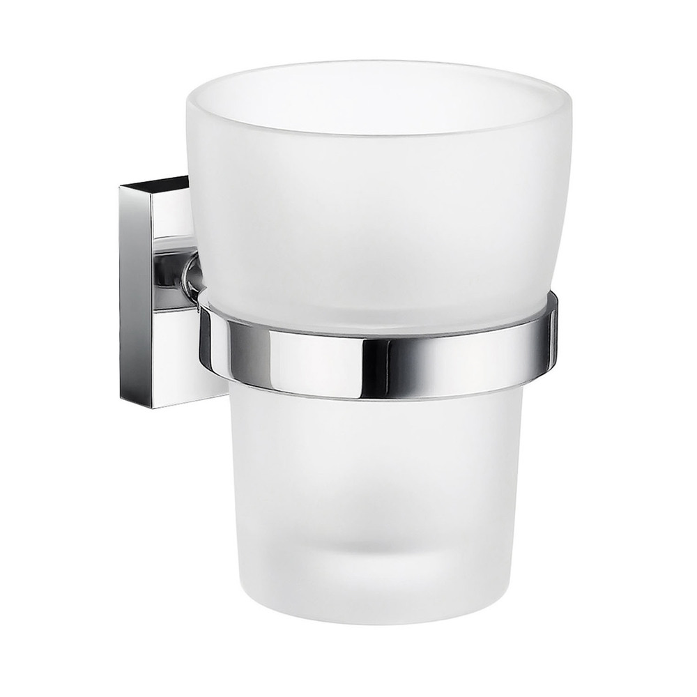 Finish: Holder in Polished Chrome on Solid Brass with Frosted Glass Tumbler