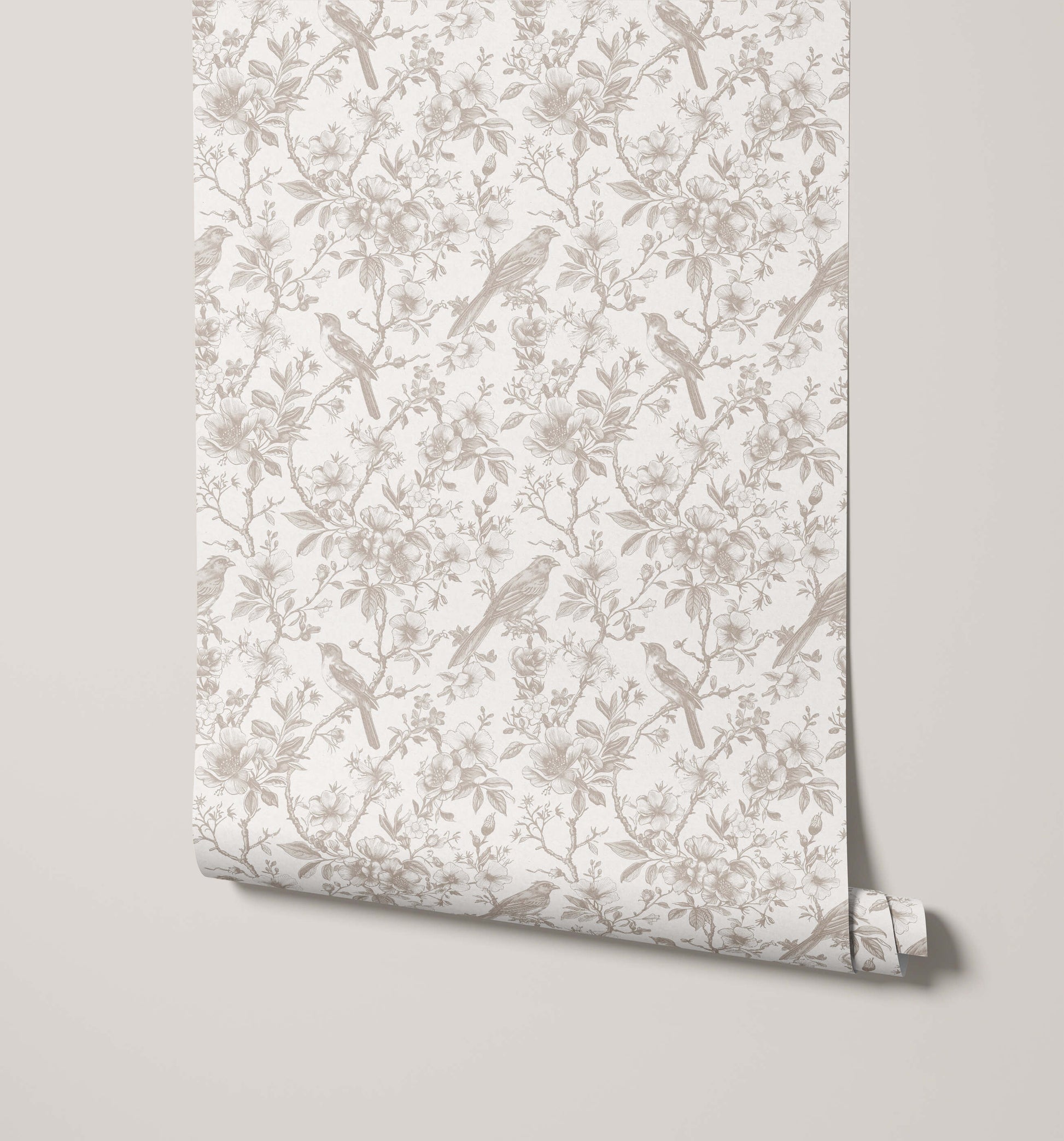Bring storybook charm and quiet elegance to your home with this Bird Toile Wallpaper. Delicate scenes of birds perched amongst blossoming branches and flowing foliage create a beautifully detailed backdrop that feels both refined and relaxed. The finely drawn line work recalls traditional engravings and classic French textiles, adding a gentle sense of history to your walls.