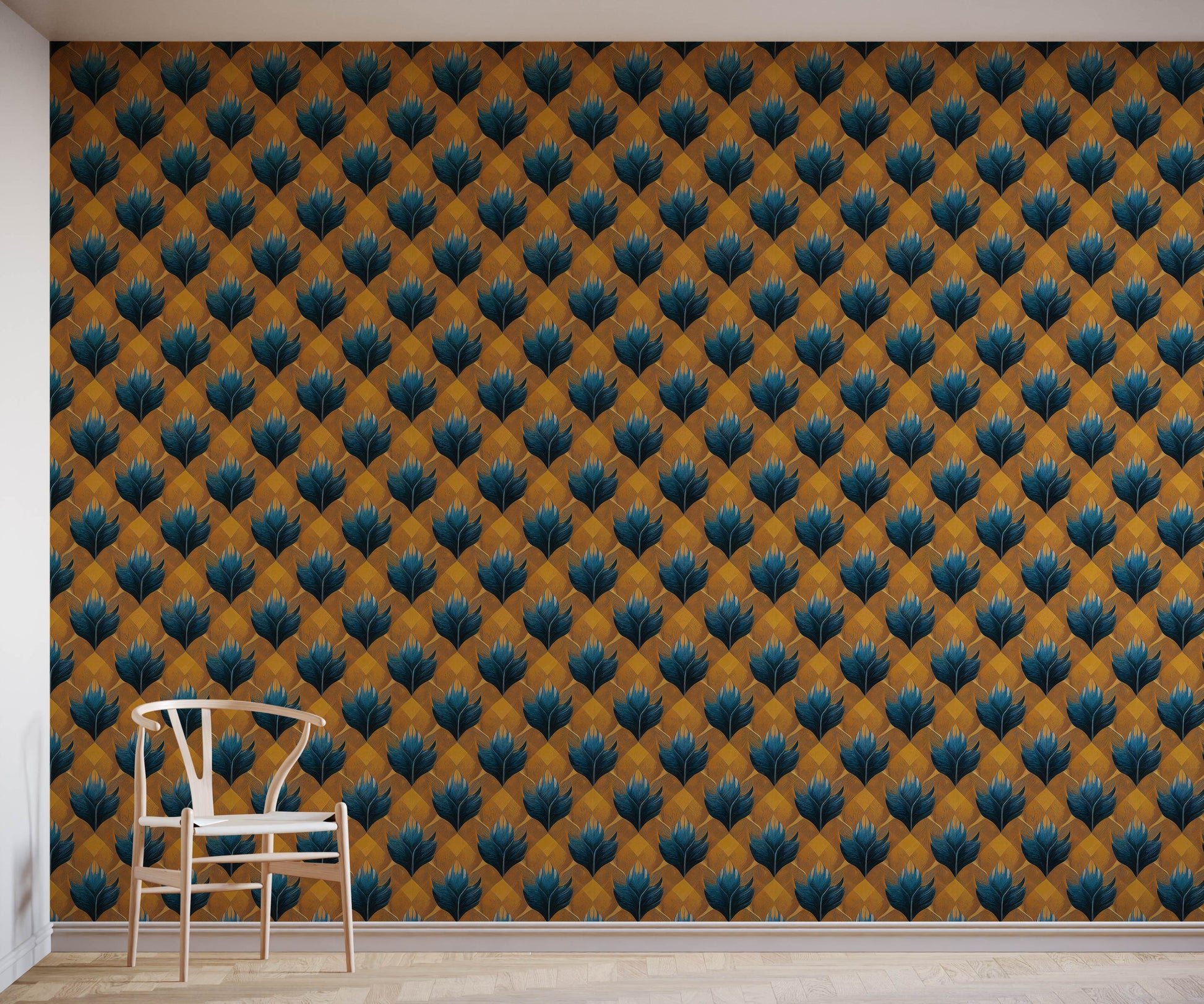 Rich in colour, this orange and blue floral wallpaper works well as a statement wall. The abstract flower motifs have been hand-painted and the brushstrokes are visible from close up. These intriguing details give them impression that the flowers are made from feathers, making it a very interesting and unique design.