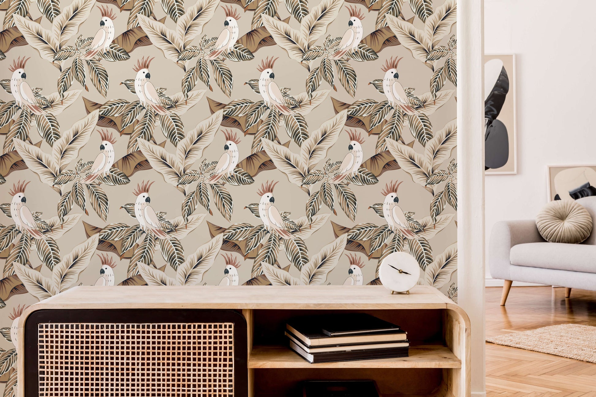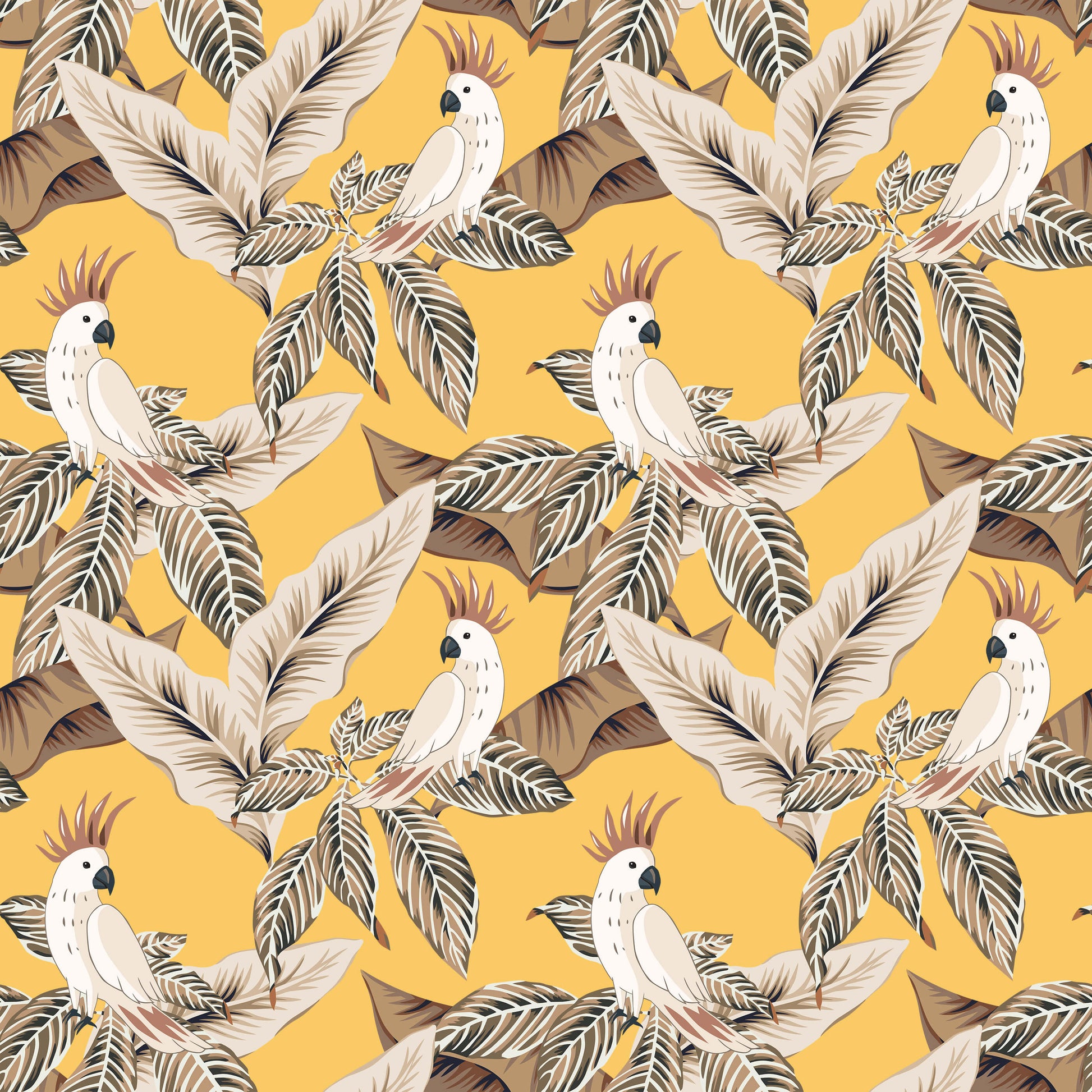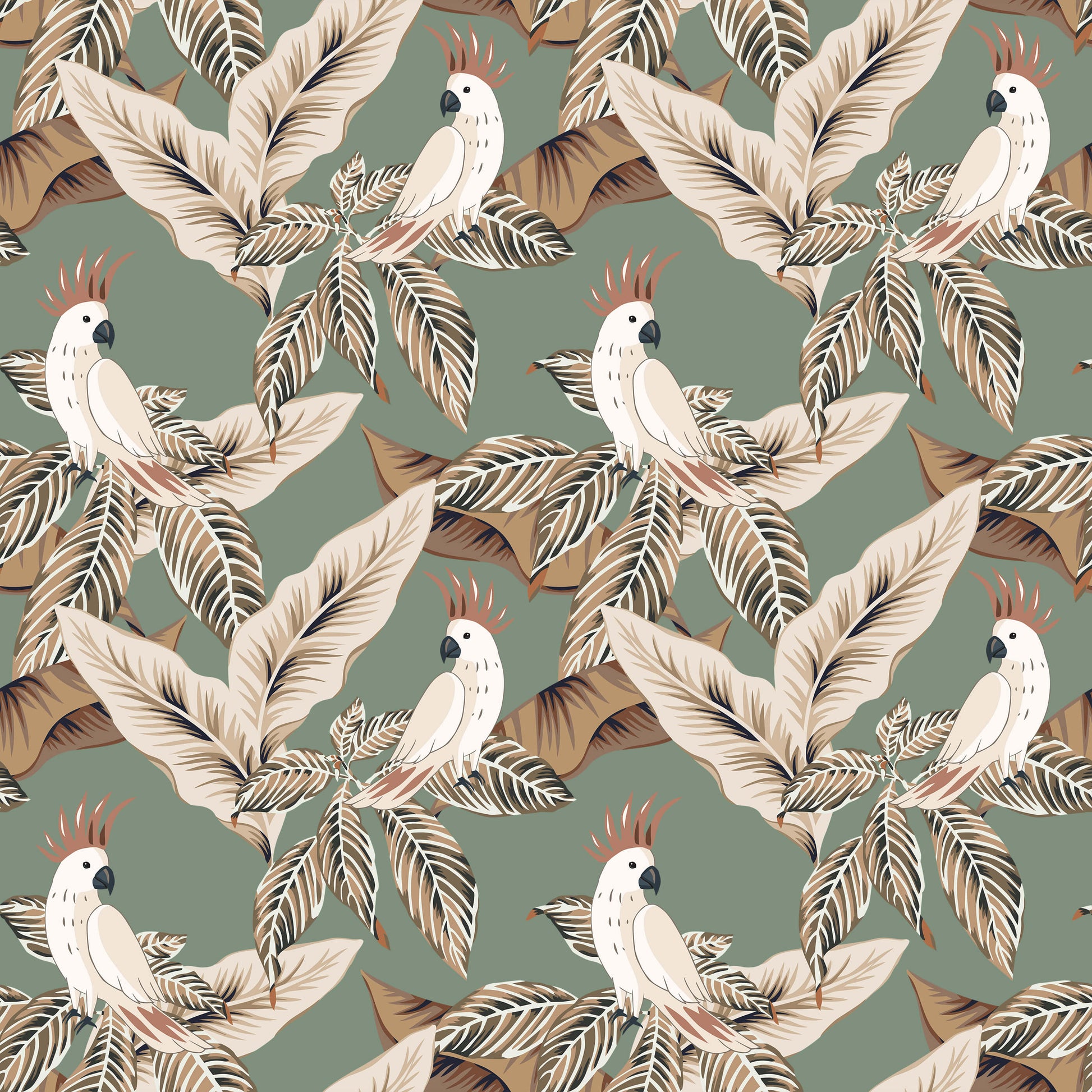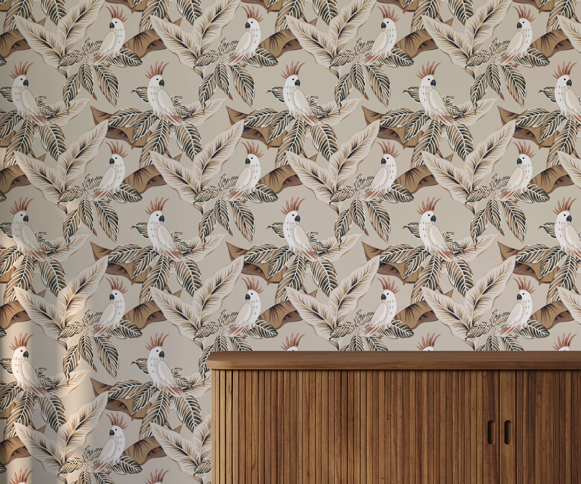 With understated tones, this cockatoo wallpaper lets you subtly bring the tropical theme into your space. Featuring a charming cockatoo amongst a variety of leaves, the design provides a vintage charm to the tropical theme.