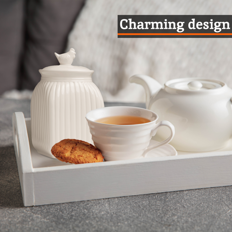 Its square silhouette keeps rows tidy and prevents wasted space in cupboards. Soft ridges add visual rhythm and a tactile touch, while the creamy glaze brings light to your worktop. The hen-topped lid is more than a cute detail; it offers a sure grip for effortless opening.