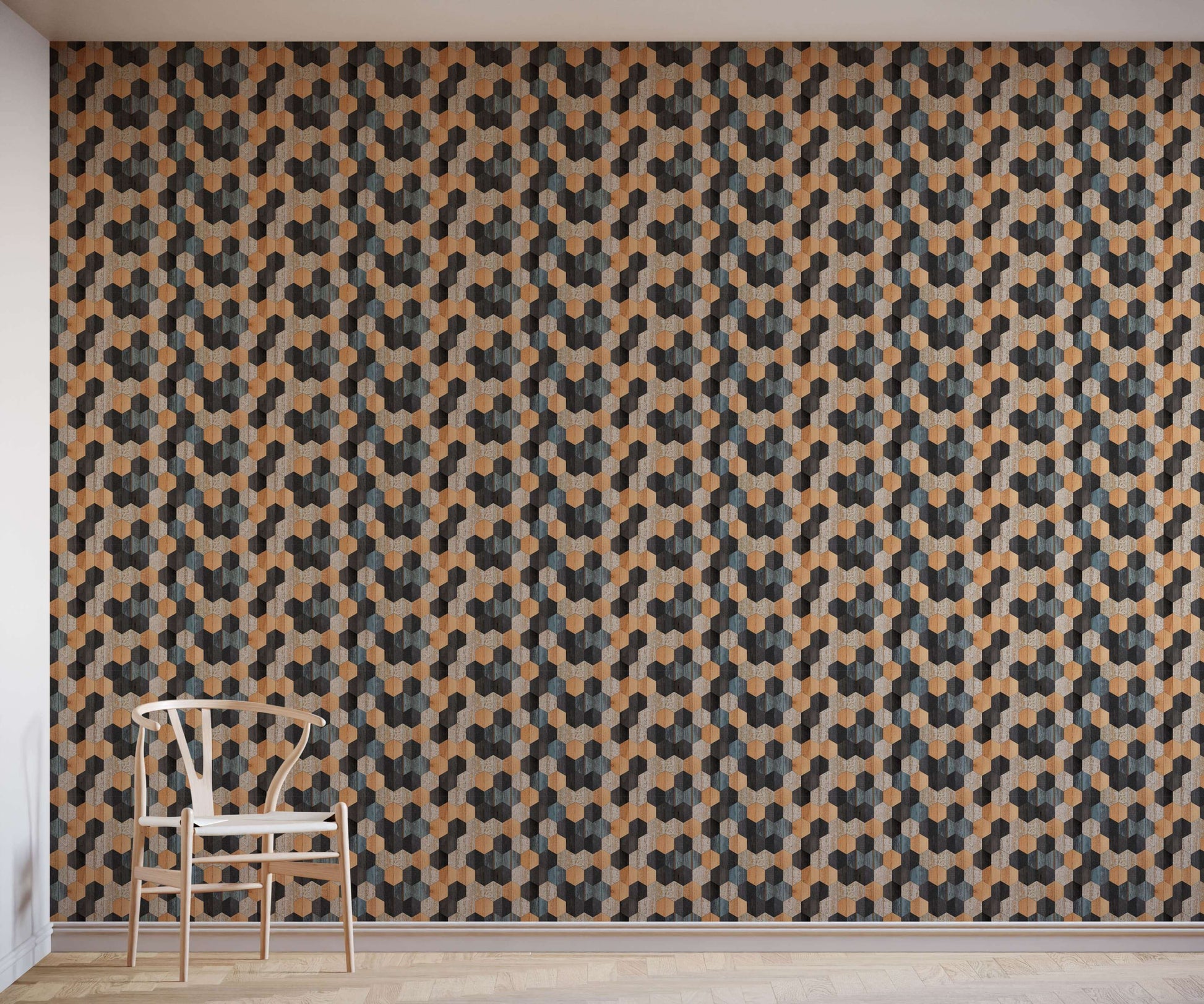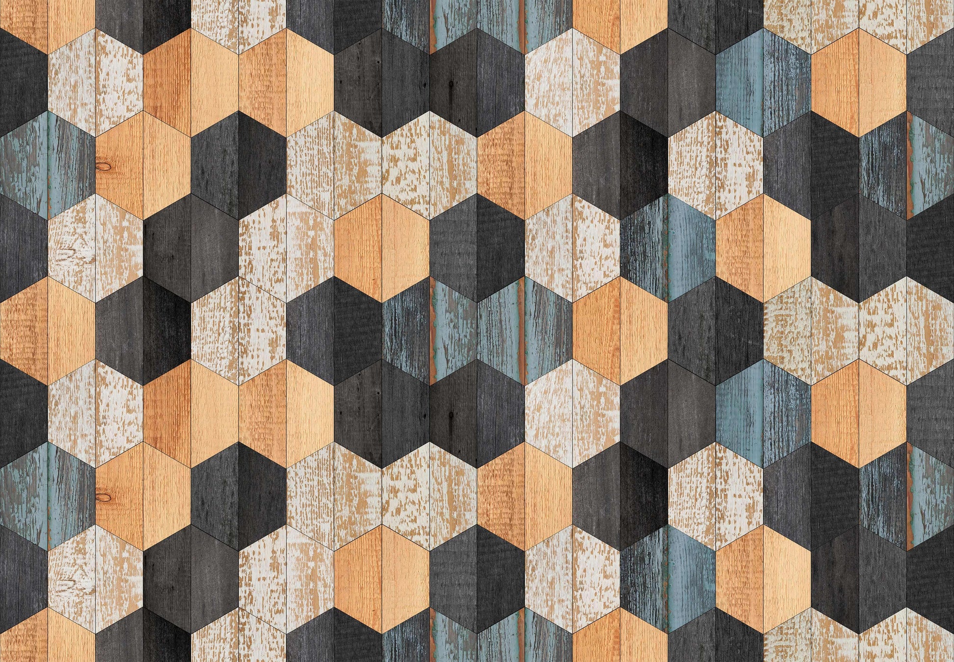 This geometric wallpaper cleverly utilises faux wood textures for a design that's full of interesting detail. Balancing a rustic finish with modern geometric shapes, the design can work well in a variety of settings. The multi coloured tones are sophisticated and help the design to pop.
