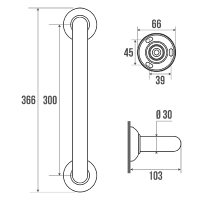 Recommended height for the horizontal part : 800 mm from the ground. Grab bars provide support and added safety if properly fitted in accordance with our technical instructions. Careful consideration and selection of the appropriate wall fixings according to the wall-mounted support is required to ensure the long life of your accessory. The use of stainless steel screws (Ø 4 mm) is highly recommended to prevent corrosion in damp environment. Before drilling, physically hold the product against the wall at desired position and mark the hole locations. All the fixing points must be respected. After installation and before use, make sure that all fixing screws are tightened securely. DO NOT use the grab bar as a step. DO NOT sit on or hang from the grab bar.