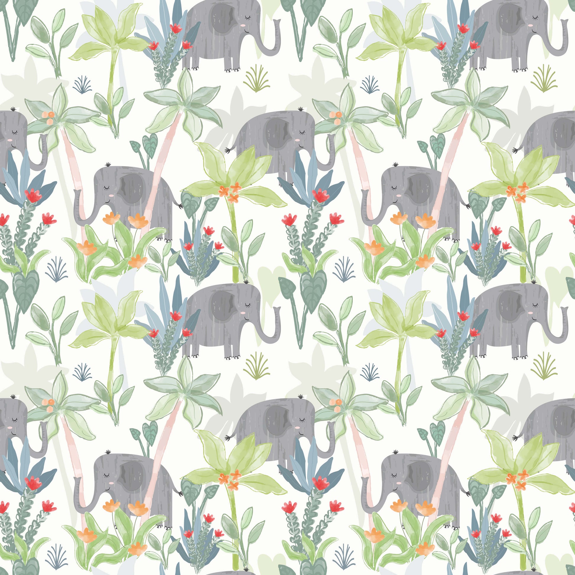 This cute elephant wallpaper was designed for babies and young children, but could work for a variety of ages. It features cute painted elephants set amongst green leaves and flowers. The design works well if you're looking to bring a sense of the jungle into your child's space, but with a whimsical, illustrative aesthetic.