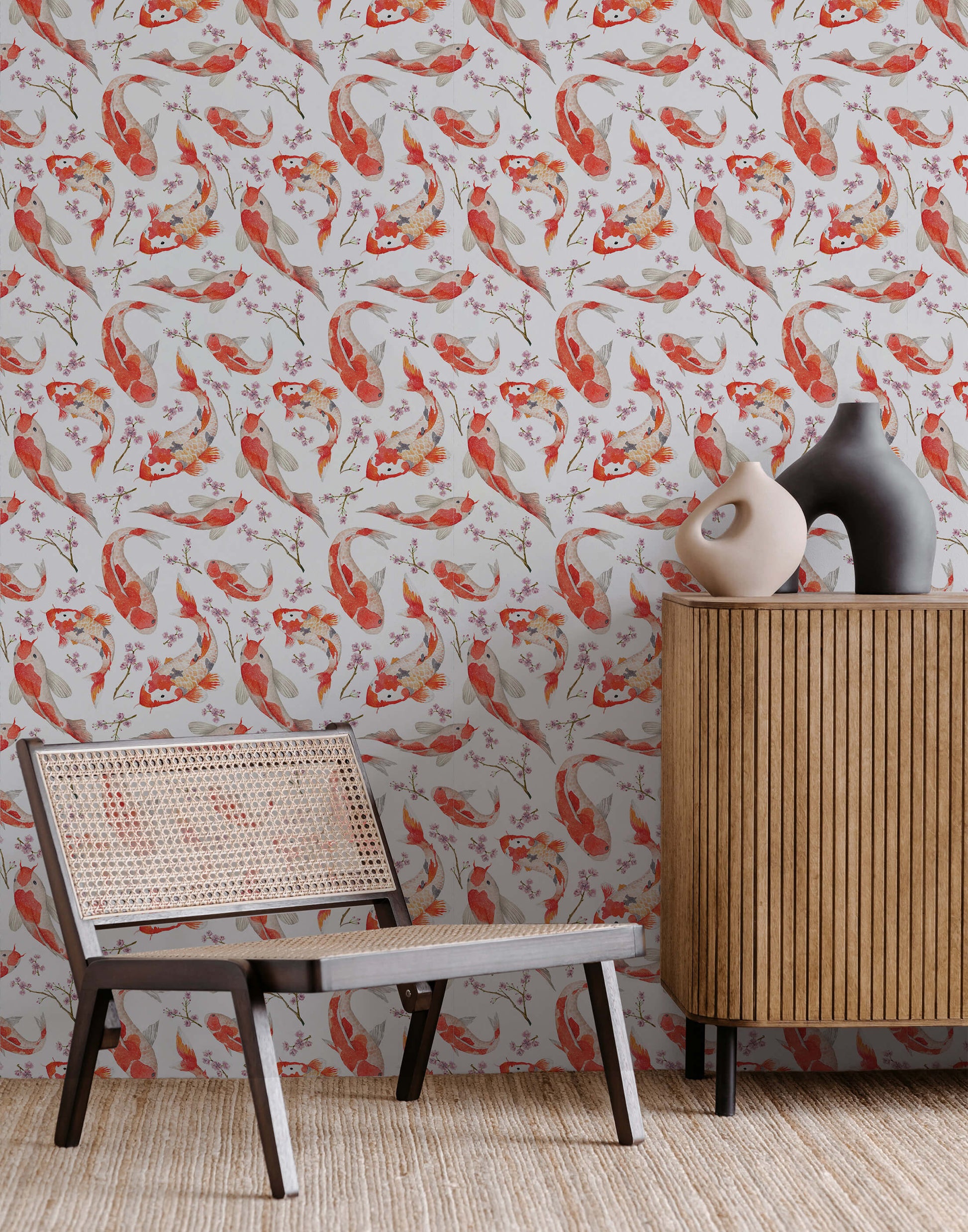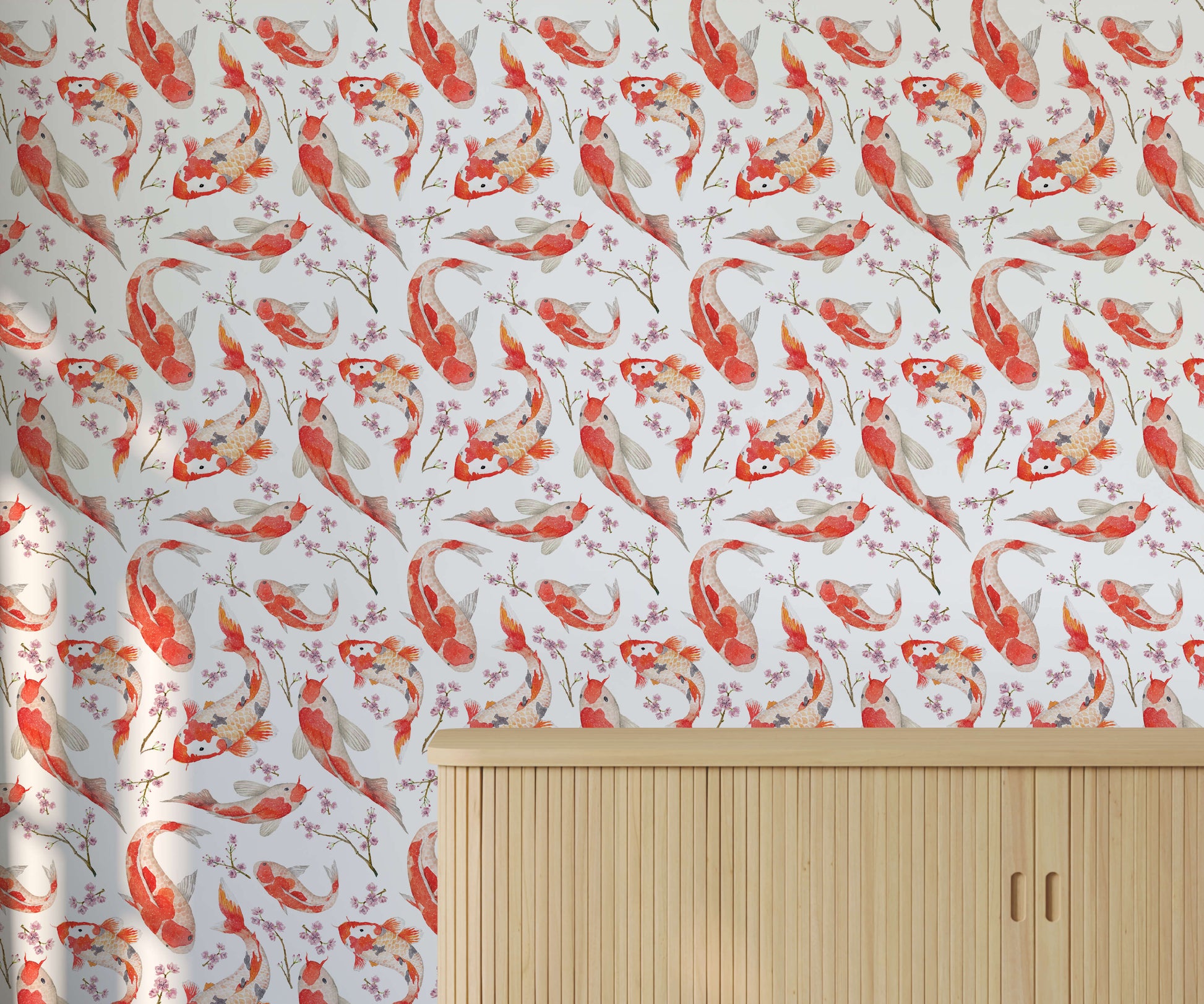 Introducing the vibrant allure of our red koi wallpaper. This captivating design seamlessly blends the symbolic beauty of red koi fish with a repeating motif, creating a visually dynamic and harmonious focal point for your walls.