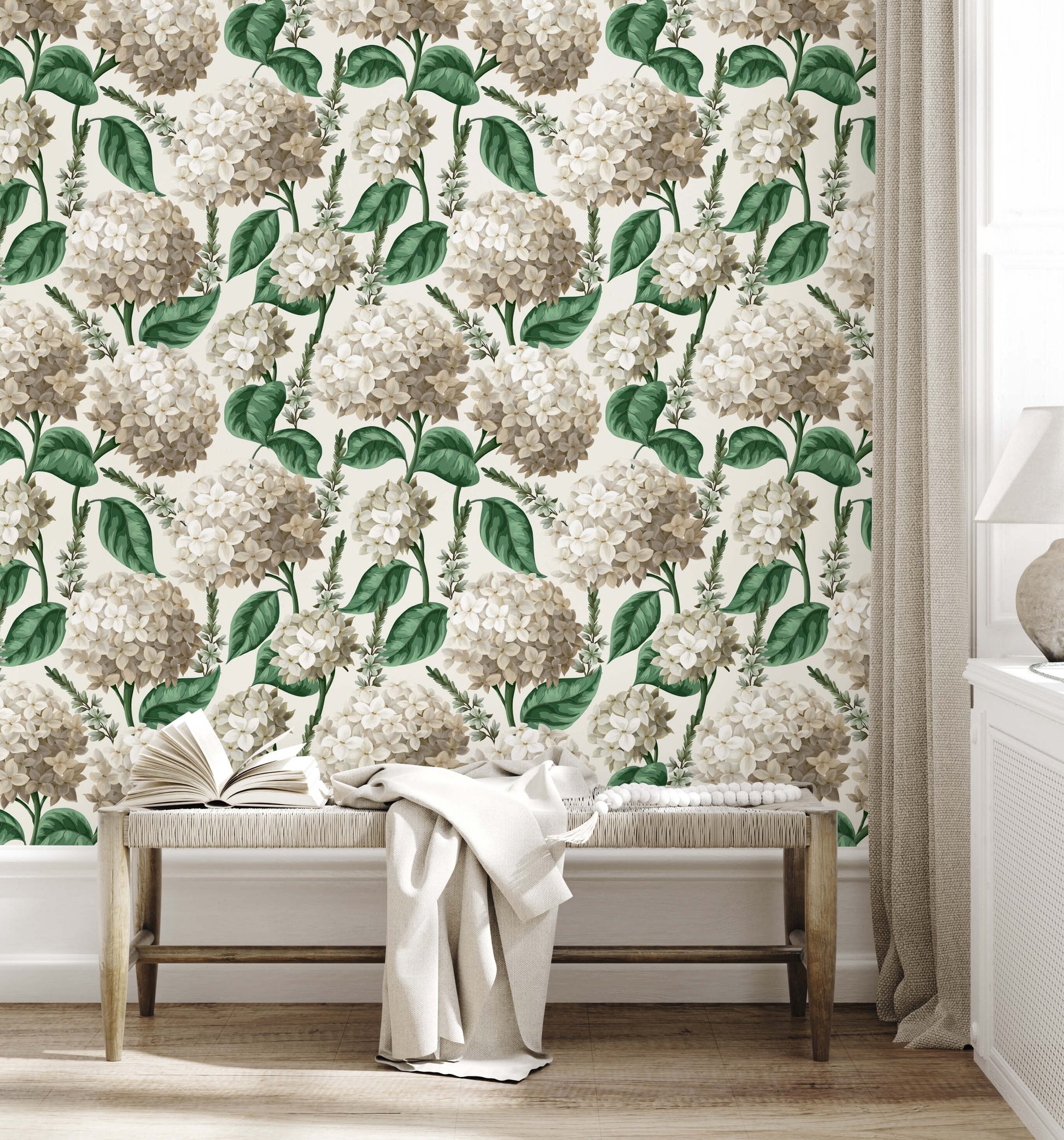 This bold hydrangea wallpaper is full of crisp detail, yet designed with a subtle watercolour effect. It's a modern design that features large white flowers with rich green foliage.