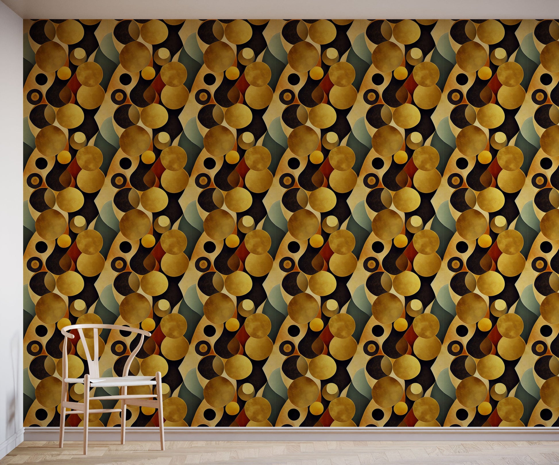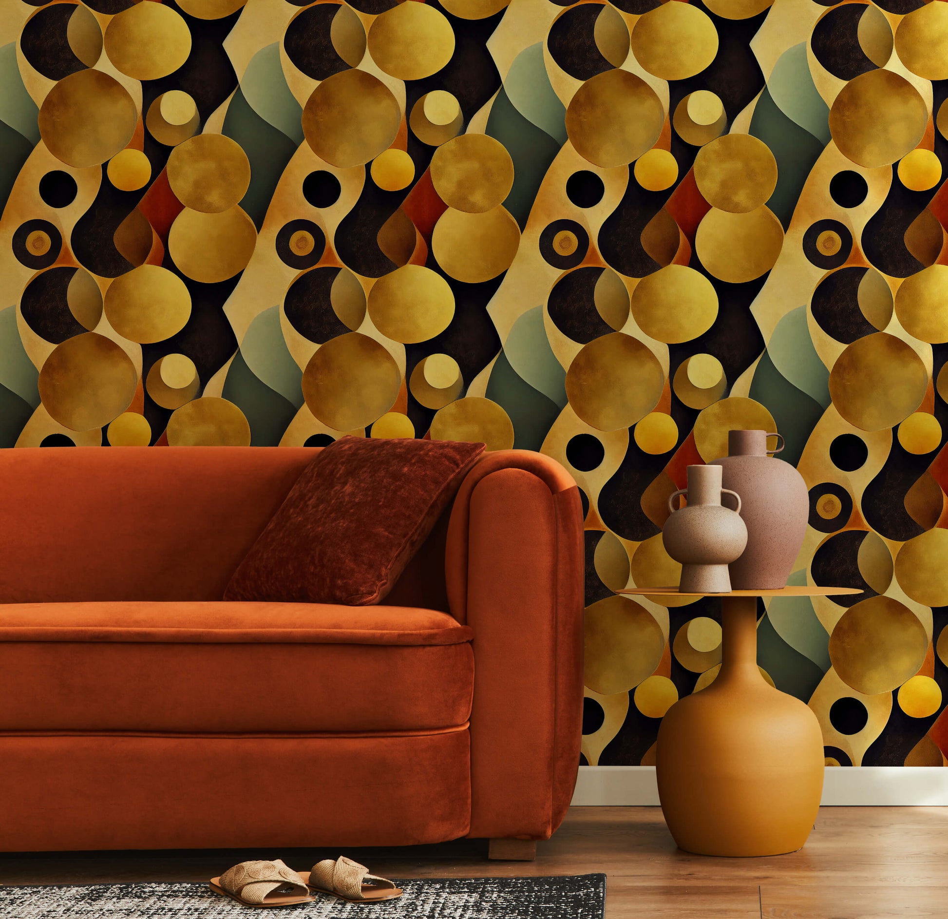 Gustav Klimt's style inspires this colourful abstract wallpaper. He is known for his ornate, decorative style, which was characterised by the use of gold leaf, intricate patterns and symbolism. This Art Nouveau style delivers bold yellow tones and an interesting 3d effect.