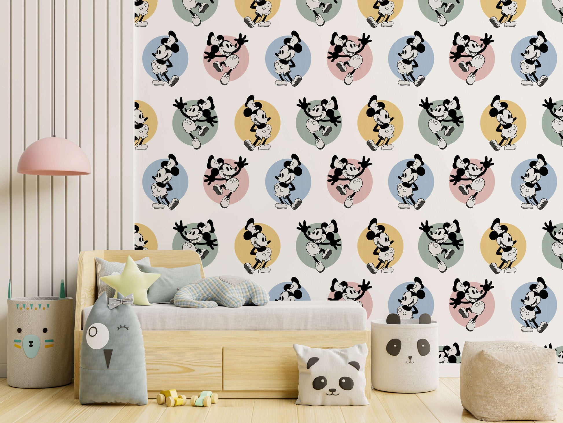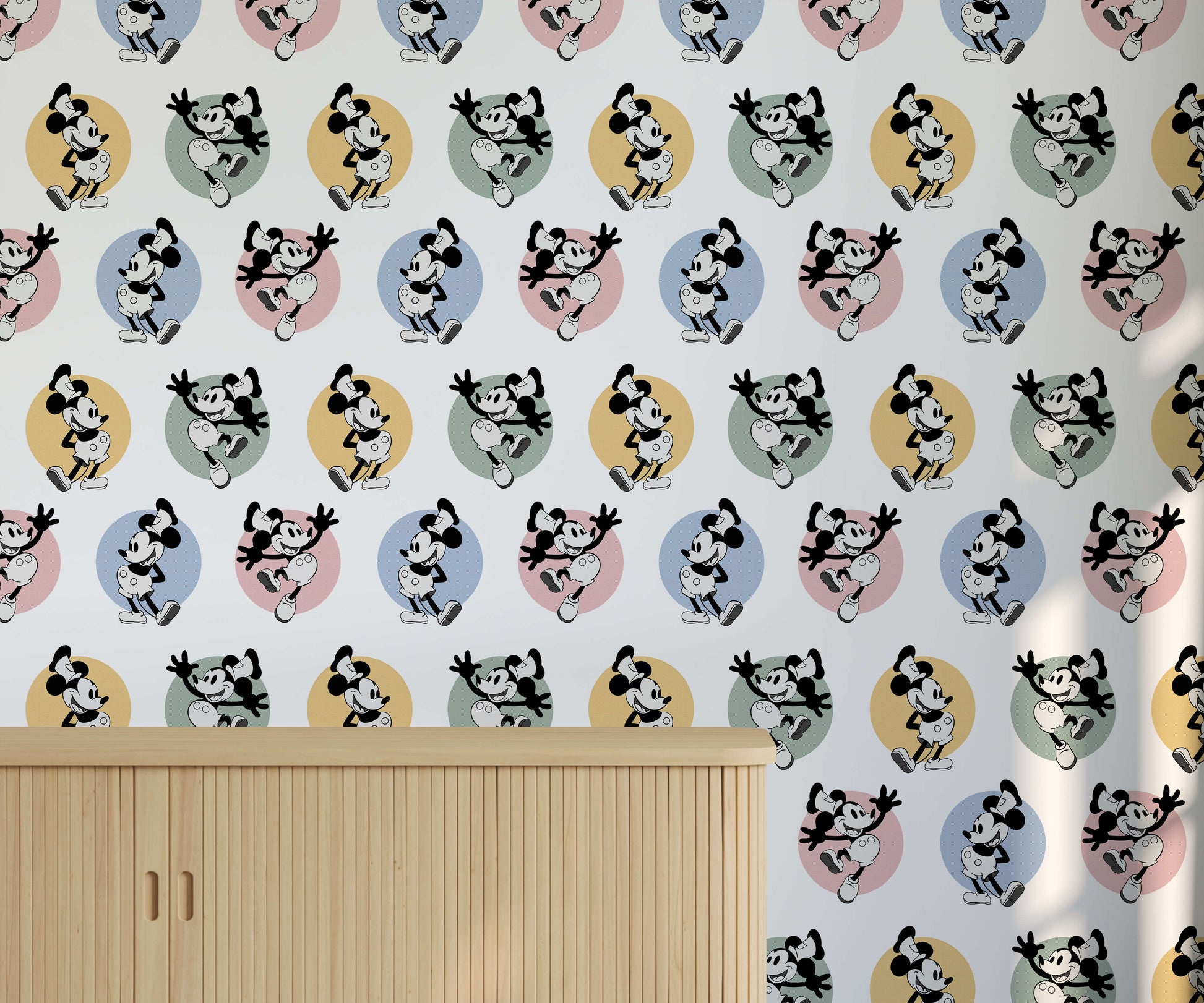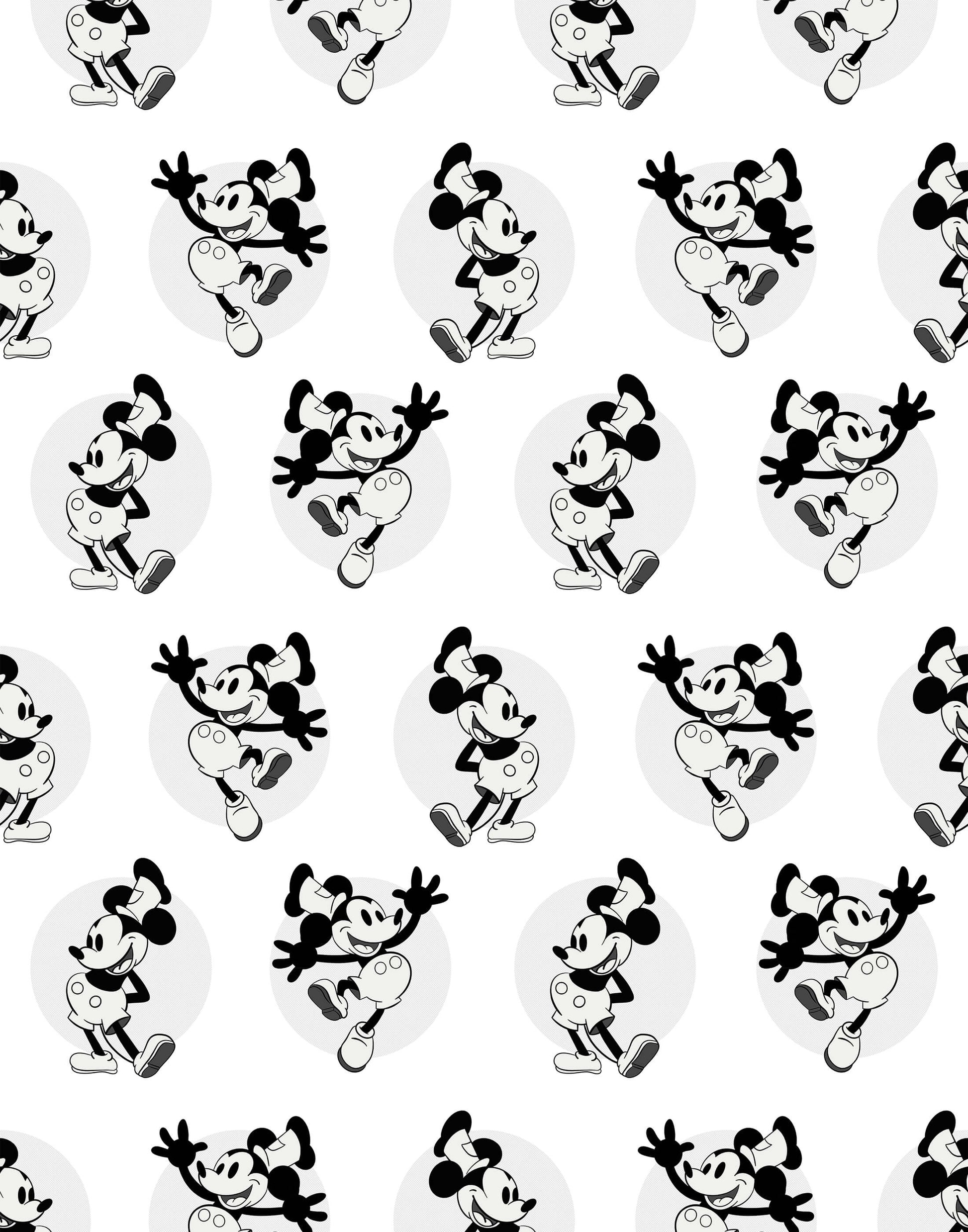 The wallpaper features remastered illustrations of the original Mickey Mouse, as depicted in Steamboat Willie. It's available in both multicoloured and black-and-white colourways.