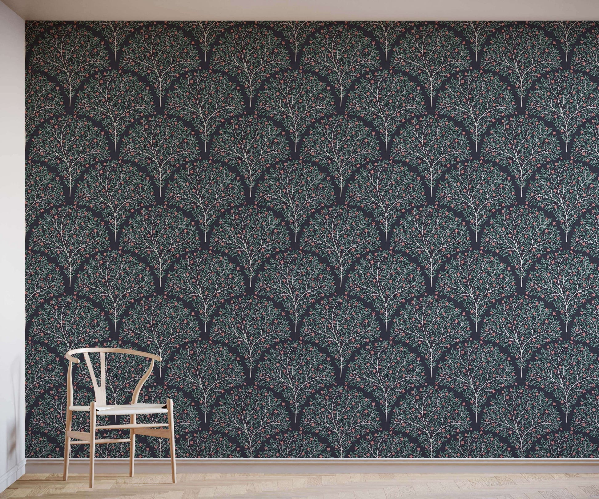 This red flower and green leaf wallpaper stands out from typical floral designs with its clever geometric composition. The arching shapes are designed at a large scale, which helps create a design that is impossible to miss. The green leaf design is accentuated with pops of red flowers to help bring a bit of extra colour into your space.